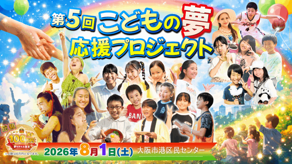 こどもの夢応援プロジェクトは、こどもの夢を大人たちが応援するための夢のコンテストです。2026年大会の決勝戦は、8月1日(土)大阪市内で開催予定です。予選を勝ち抜いた7名のファイナリストのこどもたちがグランプリをかけて自分の夢をプレゼンテーションします。大人たちが身近なこどもたちの夢の話をきく機会を作りたいそんな思いでスタートしました。 夢をきくことで、こどもたちは夢を膨らませ、大人はそのこどもを心から応援できる。 このプロジェクトを通じて他人を応援できる優しい社会を実現したいと思っています。 皆さんのご支援をよろしくお願いいたします。